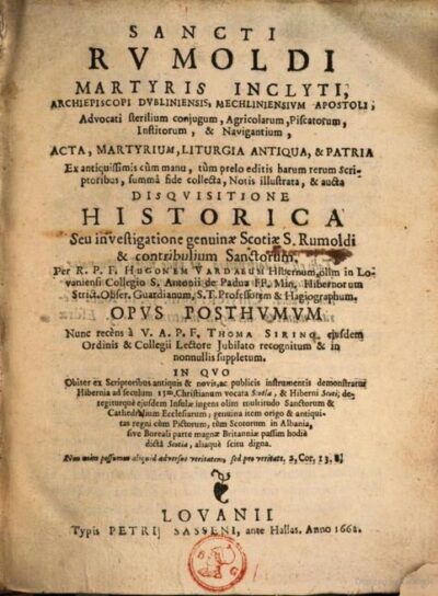 In 1645 Colgan published Acta Sanctorum ….Hiberniae Sanctorum Insulae which contained all the Irish saints whose feast-days fell in January, February and March. Two years later he published Triadis Thaumaturgae, a vast compendium of everything known about the three patrons of Ireland, Patrick, Brigid and Columba.